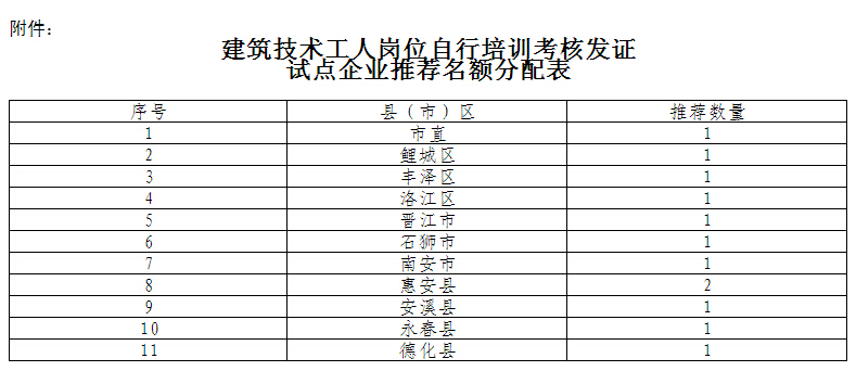 根据《福建省住房和城乡建设厅办公室关于加快推进全省建筑工人职业培训考核发证试点工作的通知》(闽建办人函〔2015〕7号)文件精神,结合我市实际情况,经市局研究决定,按照逐步放开、有序推进的原则,拟将省厅安排给我市的12个建筑技术工人岗位自行培训考核发证试点企业推荐名额分配给你们(详见附件),请你们在10月28日前将推荐企业名单上报泉州市住建局人事教育科。为高质量地完成本项工作,各地在推荐建筑技术工人岗位自行培训考核发证试点企业时,推荐的企业应为本地一级总承包、并具有培训能力条件的建筑业企业,建议参考达到以下条件要求的企业择优推荐: